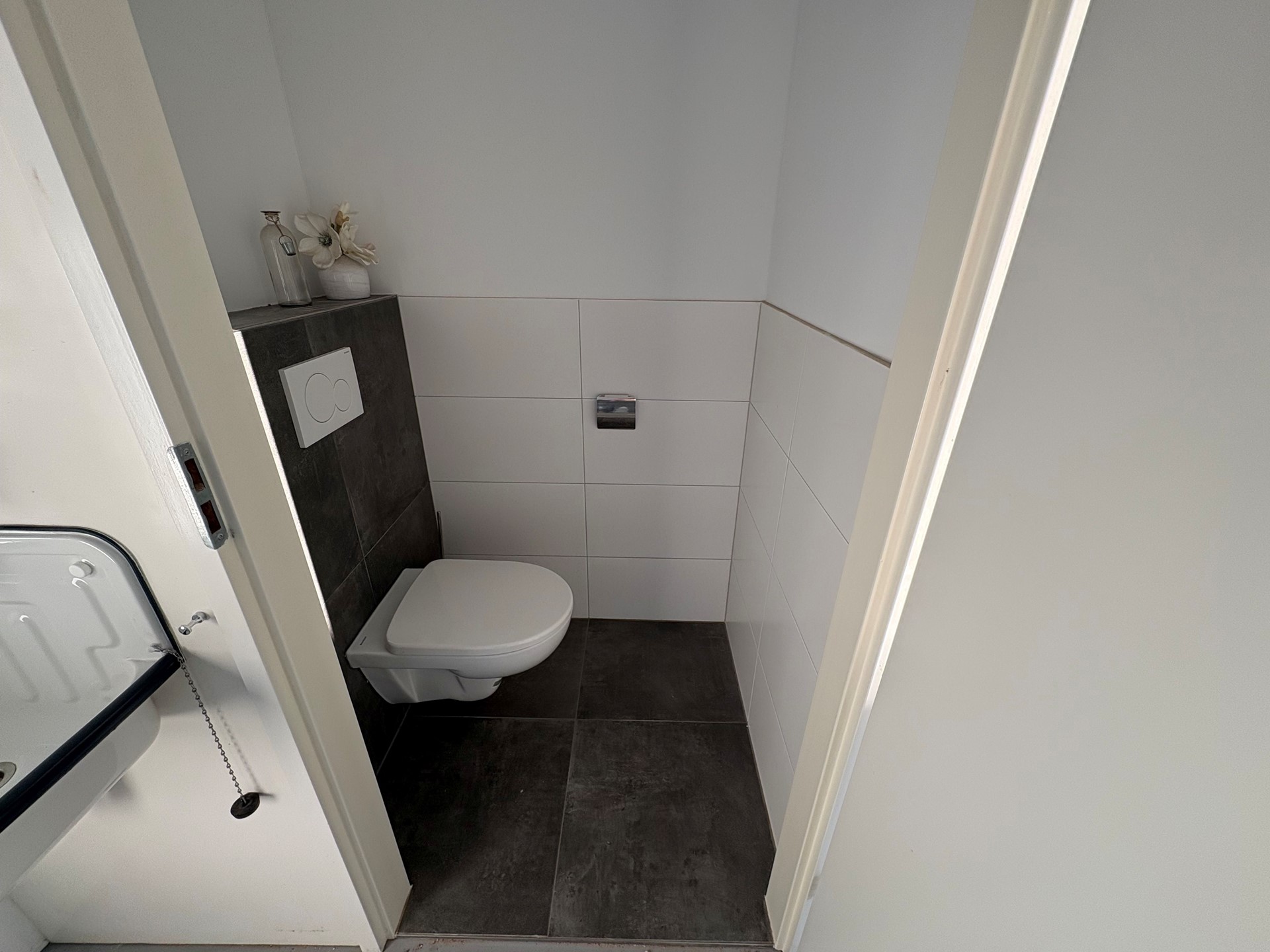 - Betegelde toiletruimte met closet (hangend model), mechanische ventilatie en verlichting;
